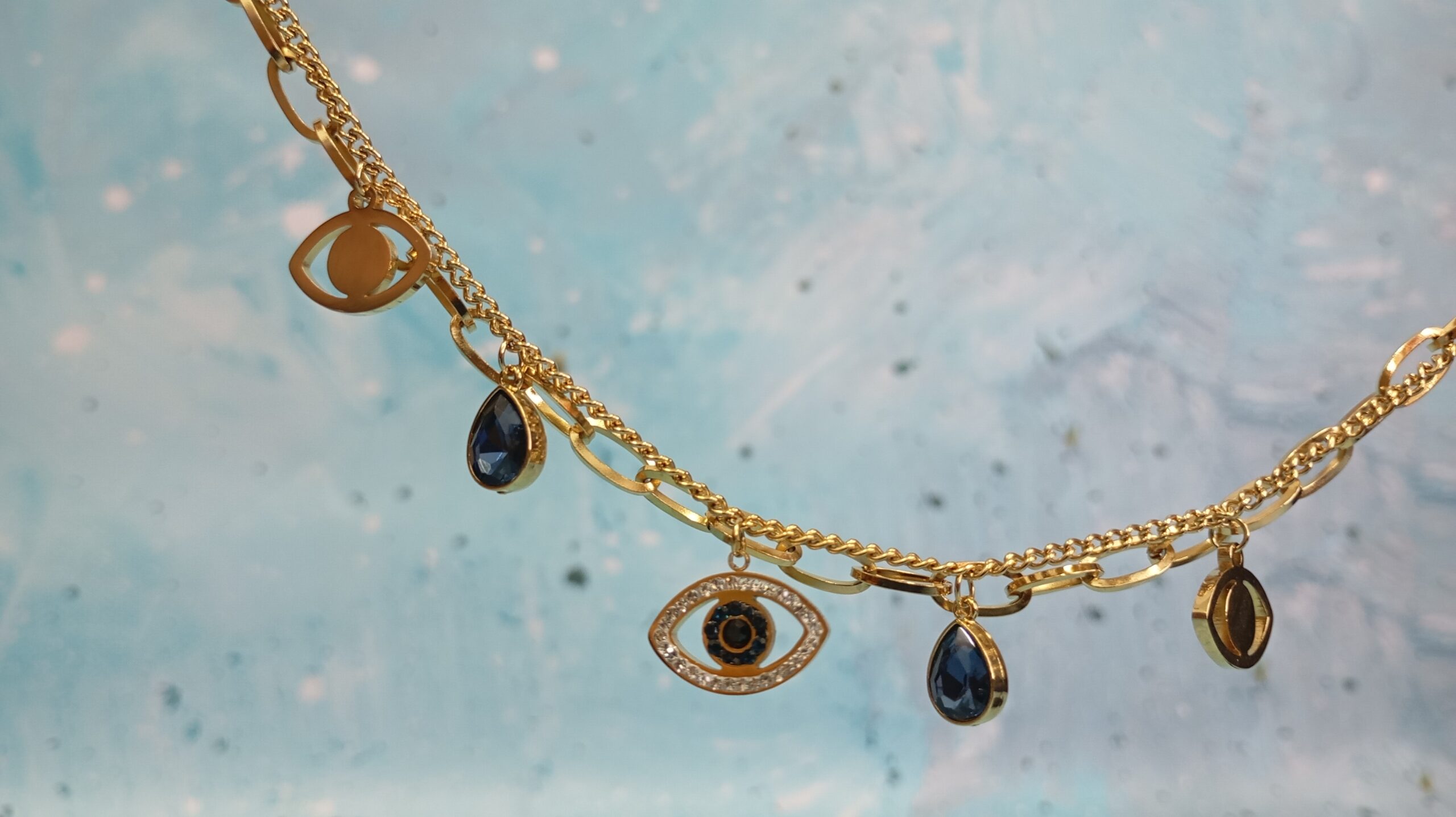 Elegant Accents: Complementing the eye charms are teardrop-shaped deep blue crystals and polished gold-toned circular dangles that add movement and a touch of luxury.