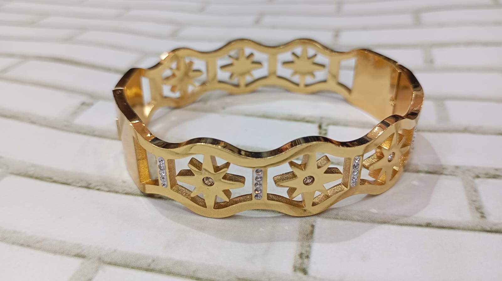 Elevate your everyday style with this gold-tone cutwork bracelet, designed with elegant star motifs and subtle crystal accents. The openwork pattern and wavy silhouette create a striking balance of modern design and classic charm.