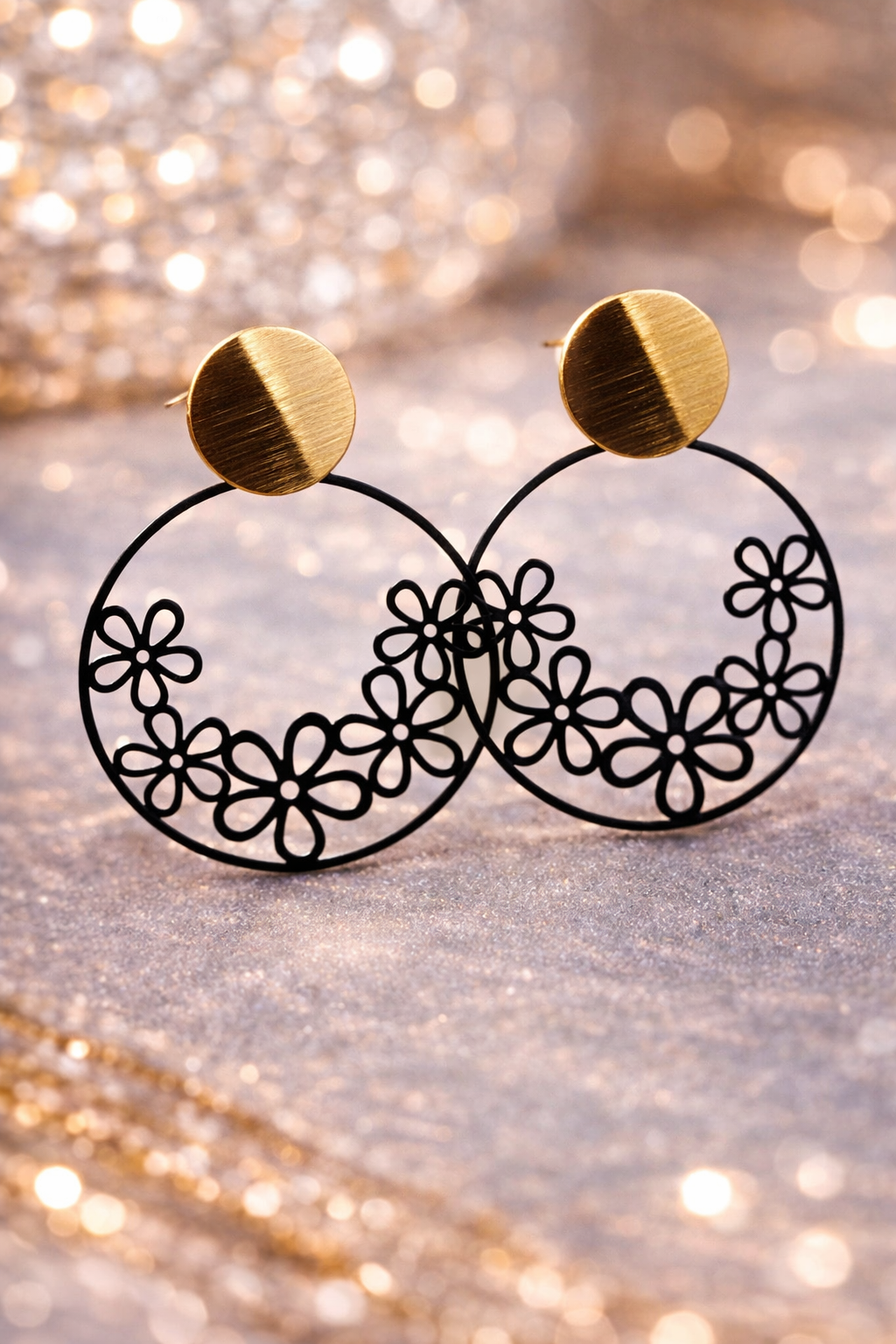 A0166-Floral Black Hoop Earrings with Gold Disc Studs