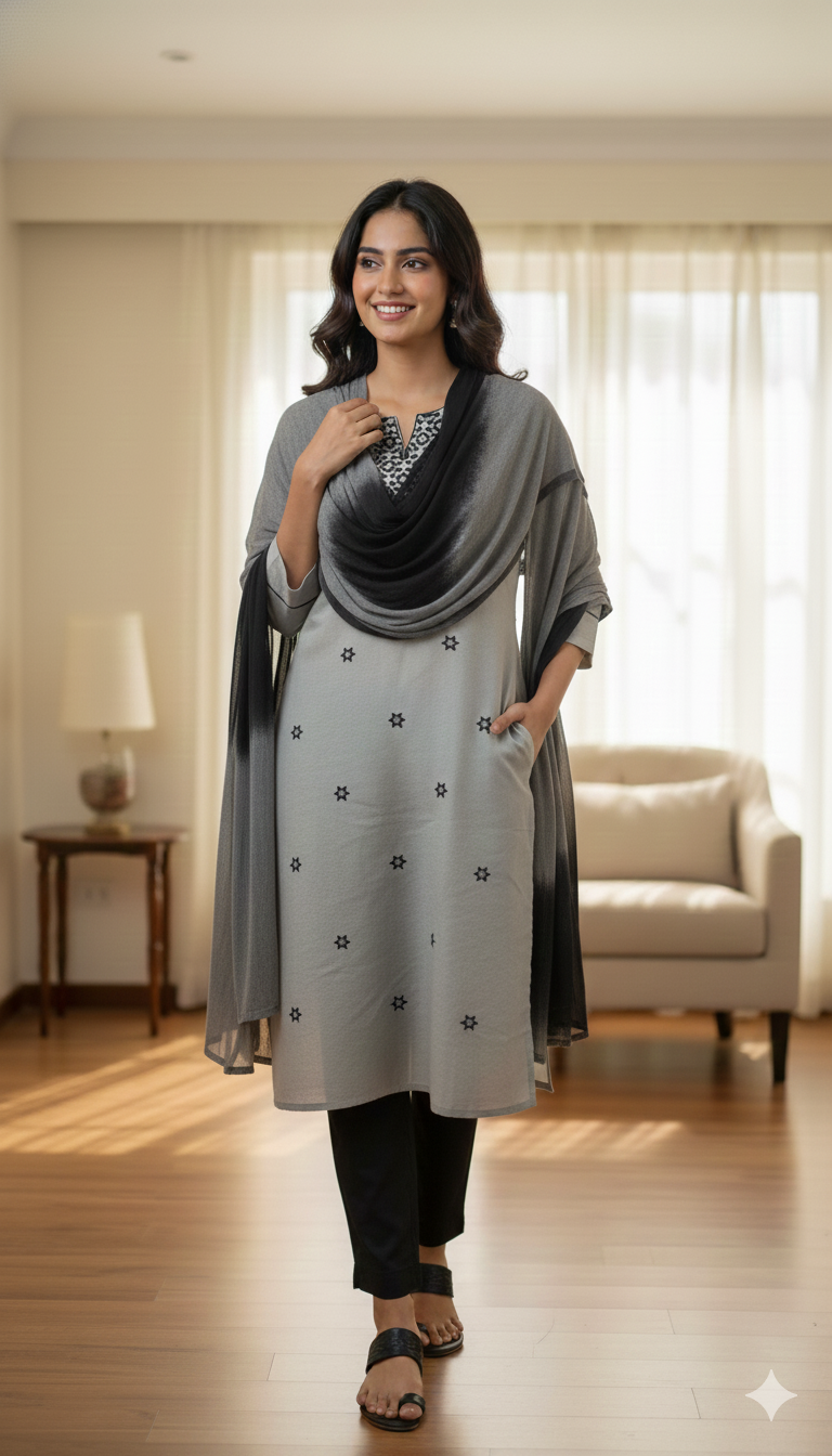 Paired with a lightweight grey dupatta that drapes gracefully, this ensemble is perfect for casual outings, office wear, or small festive gatherings. Style it with black leggings and minimal accessories for a refined, modern ethnic look.